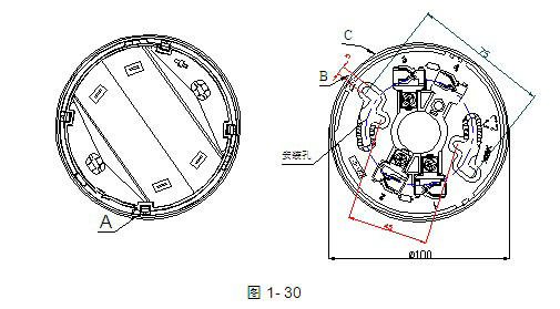 待定位底座安裝牢固后,將探測器底部上的對位標識A對準定位底座B處,將探測器順時針旋轉到定位底座C處即可安裝好探測器,探測器底部及定位底座示意圖如圖1-30所示。