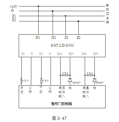 a.模塊與防火卷簾門電氣控制箱(標準型)接線示意圖如圖2-46(無源常開檢線輸入)、圖2-47所示(無源常閉檢線輸入):